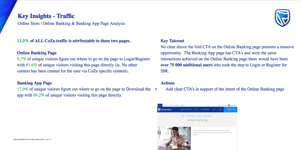 Furthermore, a significant aspect of my role revolves around devising strategies to increase traffic and attract visitors to the Standard Bank Online Store and Online Banking platforms. This is approached from a UX perspective, involving a careful evaluation of user journeys, intuitive navigation, and optimizing the overall user interface to encourage user engagement.